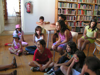 Lá começaram a vestir os pijamos...e vieram ouvir algumas histórias. Uma das que foi lida foi a Segredo da História e da Lua. Depois também leram...principalmente partes de obras da autora em destaque do mês de Julho: Luísa Ducla Soares. Foi uma grande animação, às vezes um bocadinho excessiva..
