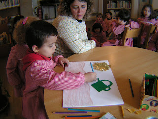 De seguida fizemos um desenho especial, porque as ilustrações da história também são especiais e diferentes. Numa folha desenhou-se a terra; colaram um regador e um sol, depois cada um pintou uma gotinha de água ou uma semente. Assim todos participaram.